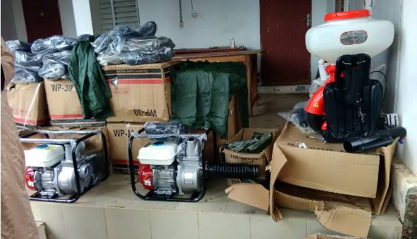Par le biais de M. Boun Oumar DIA qui le représentait à la cérémonie, Mame Boye DIAO a remis au gouverneur de la région, également responsable du Plan Orsec, un lot de matériel composé de 7 motopompes, des pulvérisateurs, des bottes et des imperméables.